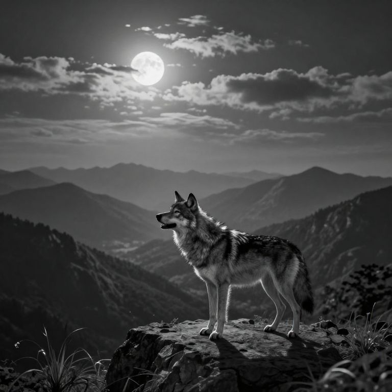 Envision an idyllic landscape captured in the soft, dreamy strokes of impressionist artistry, where a solitary wolf stands atop a rugged cliff, gazing out over a boundless ocean at dusk. The scene beautifully encapsulates nature's serenity through gentle brushstrokes that depict the sun's golden light gradually melting into the horizon, casting its warm glow upon the softly undulating waves below. From an aerial viewpoint above the majestic creature, the wolf's fur appears to meld harmoniously with the surrounding terrain as it stands resolute against a backdrop of a dreamlike, impressionistic sky, instilling a profound sense of solitude and contemplation in this awe-inspiring moment of natural unity.