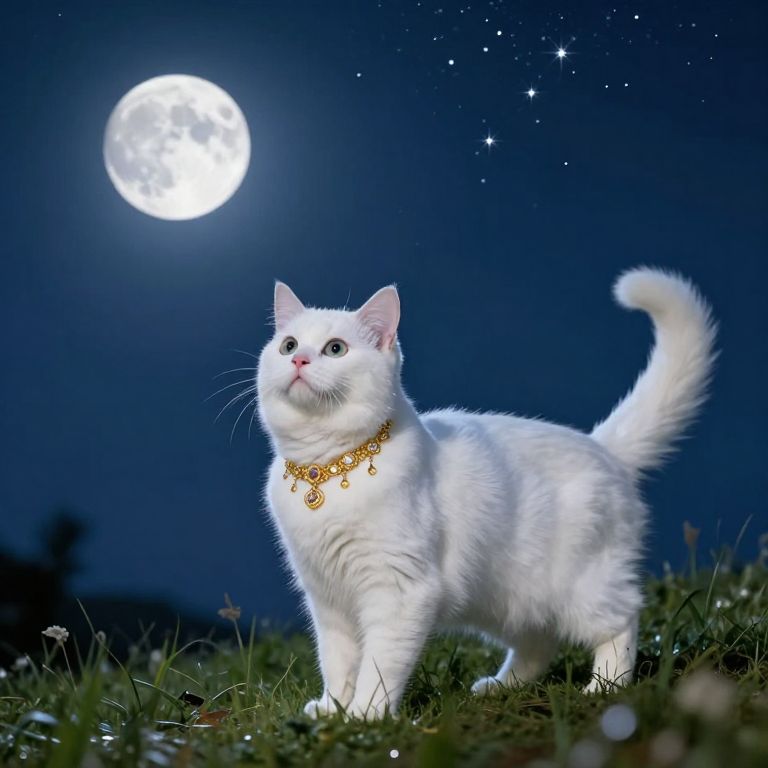 Whiskered under a starlit sky, a regal white cat stands atop a grassy hill, its golden collar adorned with sparkling jewels, gazing toward the luminous moon and twinkling stars that dot the celestial expanse above.