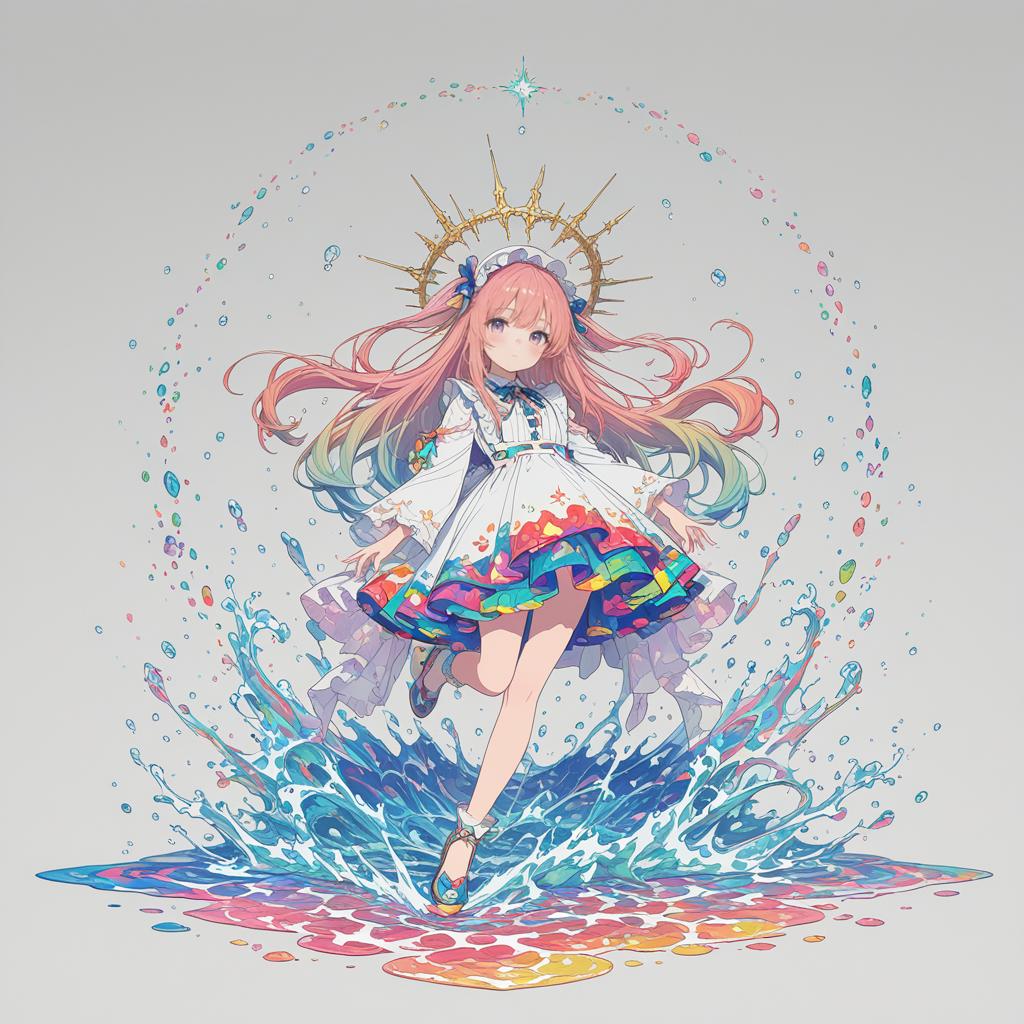 (masterpiece, top quality, official art:1.2), (flat color:1.5), (colorful), looking at the viewer, 1girl, solo, white background, floating colorful water