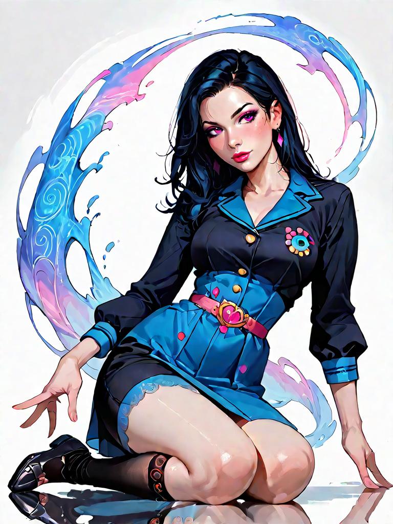 Digital illustration of a woman with a realistic face and full body shot, wearing a black and teal business casual outfit. She has long black hair, bright pink eyeshadow, and red lipstick. Her ensemble features a semi-sheer blouse with paisley pattern, three-quarter sleeves, a black mini skirt with lace-up details, black stockings, and pointed black shoes. A decorative pink belt with a heart buckle cinches her waist. Artistic swirls of blue and pink water surround her, enhancing the dynamic and stylish vibe.