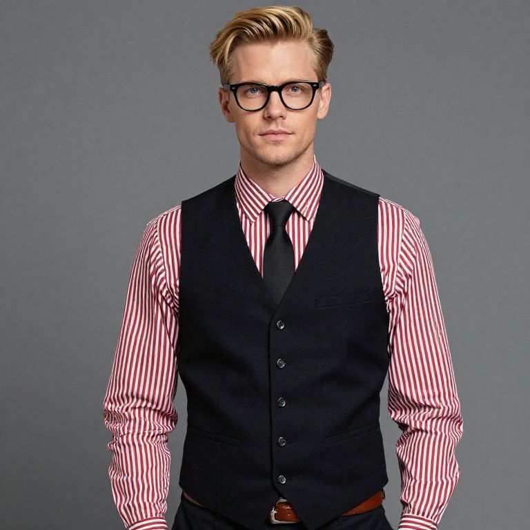Photograph of a Caucasian man with light skin and short, styled blond hair, wearing black-rimmed glasses. He is dressed in a black vest over a red and white striped shirt, paired with a black tie. His expression is neutral, and he stands against a plain gray background. He has a slim build and is wearing dark trousers with a brown leather belt. The lighting is even, highlighting the contrast between the vest and striped shirt. The overall style is modern and slightly formal.