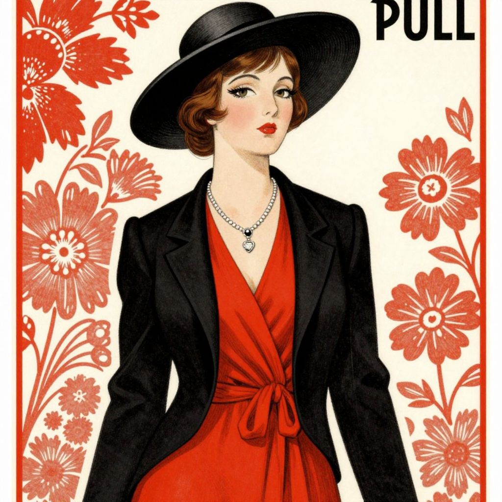 Digital illustration of a stylish woman in a black hat, red dress, and black blazer, with floral background and "PULL" text.