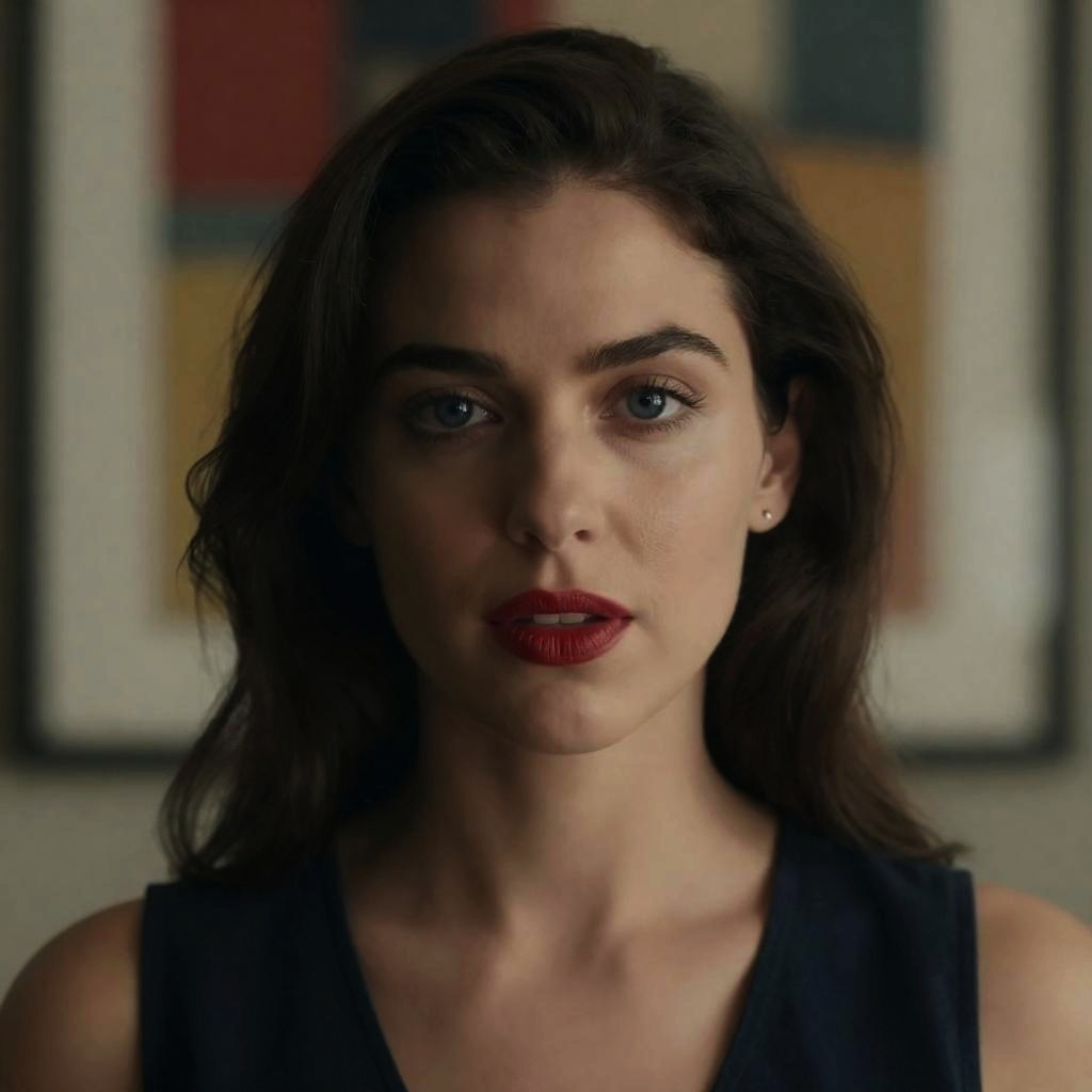 Photograph of a woman with fair skin and shoulder-length brown hair, wearing a dark blue top with red lace trim, standing indoors near a sunlit window. She has a serious expression, light makeup, and a silver necklace. Background includes blurred potted plant and furniture. Sunlight creates soft shadows on her face.