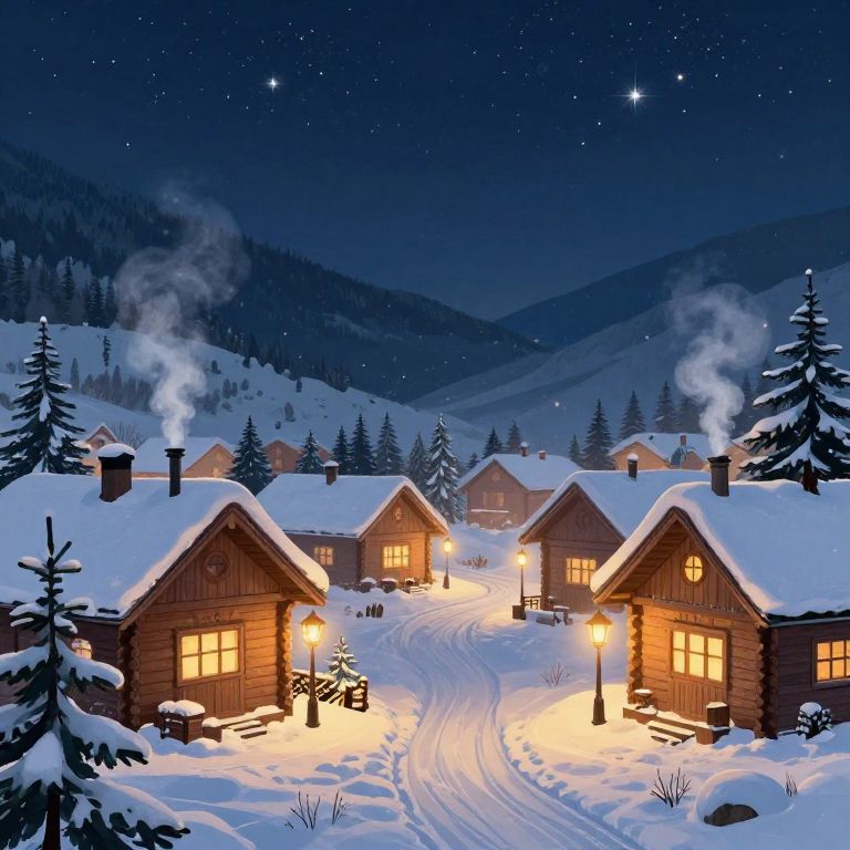 Porly depicted as a serene mountain village during winter, cozy wooden cottages with smoke rising from chimneys, snow-covered pine trees under a starry night sky, warm glowing lanterns illuminating pathways, peaceful and inviting illustration style.