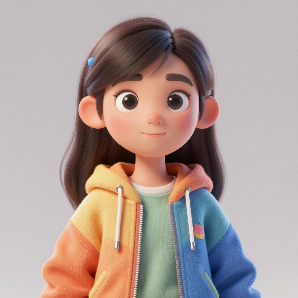 Digital 3D cartoon girl with large eyes, dark hair, orange-yellow-blue hoodie, green shirt, hair clip, smiling, white background.