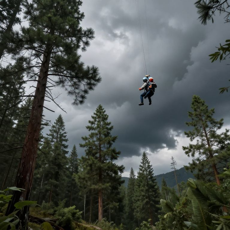 Photograph of a person zip-lining through a dense forest of tall pine trees, with dramatic, cloudy skies overhead and distant mountains in the background.