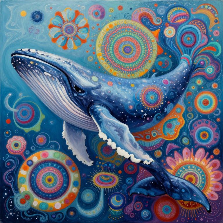 Vibrant digital painting of a blue humpback whale with white underbelly amidst colorful, swirling circles and sunflowers in a blue ocean background