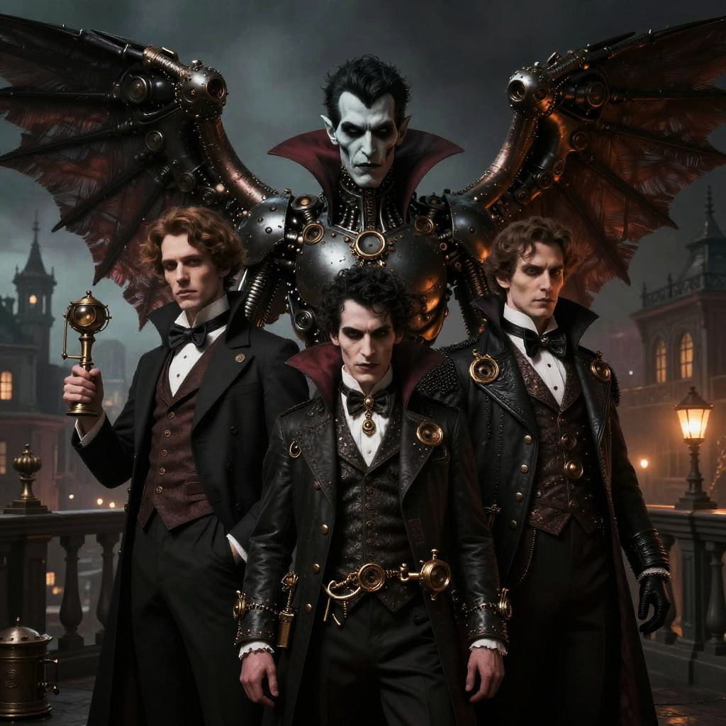 Midjourney prompts for characters, steampunk adventurers exploring a dense foggy forest, characters in Victorian-inspired gear with mechanical gadgets, detailed textures, atmospheric light filtering through trees, sense of mystery and discovery.