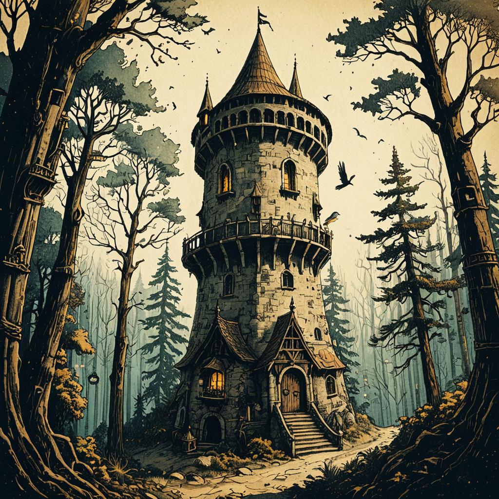 Anton Pieck style illustration of a medieval fantasy wizard's tower in the trees, bird's eye view, in the forest, vintage paper texture, intricate line work, high detail, mystical atmosphere, warm and nostalgic tones, soft lighting, high quality, magical artifacts, nostalgic, warm tones, soft lighting