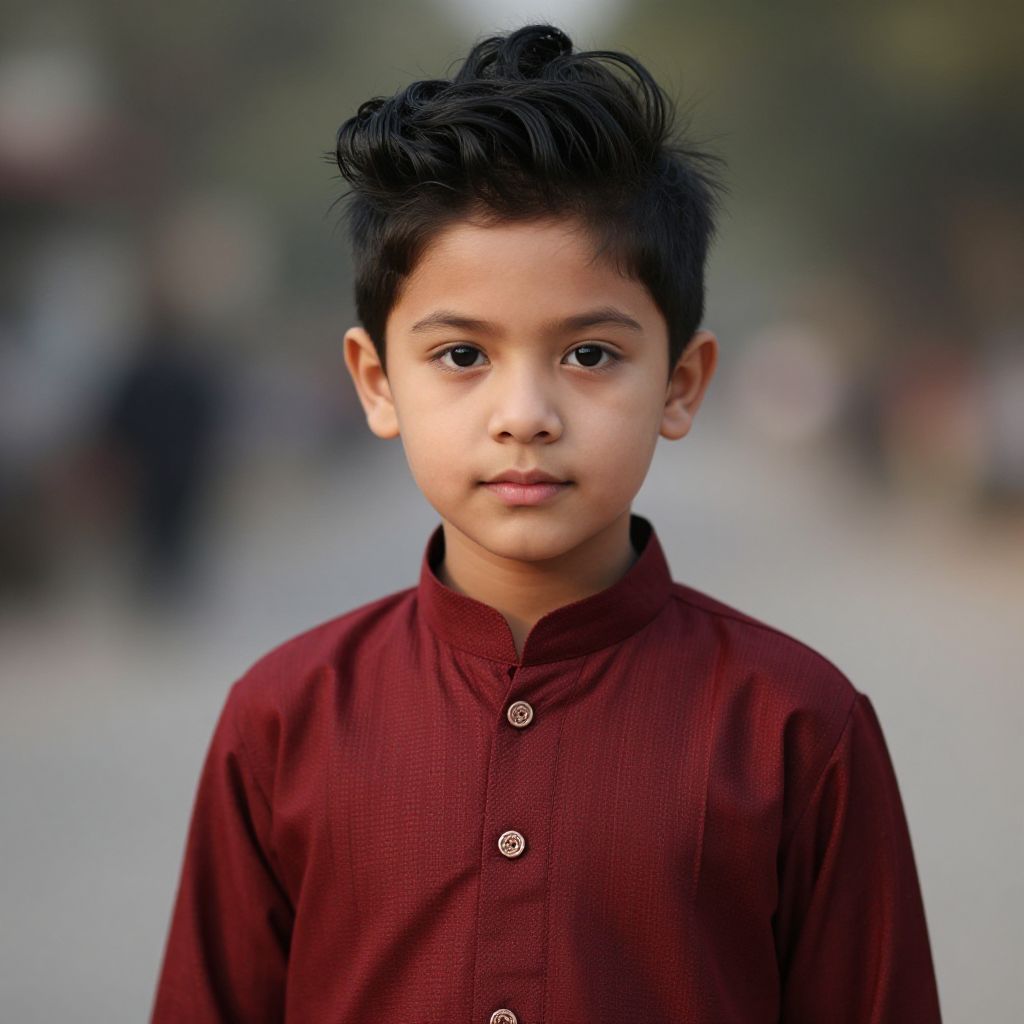 Photograph of a young South Asian boy with black, neatly styled hair, wearing a deep red button-up shirt, standing outdoors with a blurred background.