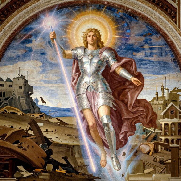 Craft an image blending Renaissance frescoes with futuristic elements, depicting a celestial being clad in radiant, shimmering armor wielding a celestial rod radiating vivid light beams over a lifeless, post-apocalyptic terrain. This scene is captured from a high vantage point, combining the grandeur and dramatic flair of ancient art with contemporary digital enhancements, resulting in an arresting amalgamation of historical aesthetics and modern technology. The awe-inspiring vista conveys a deep sense of optimism amidst devastation, as the celestial figure's luminescent aura envelops the barren world below, inspiring both reverence and amazement at the splendor and endurance of life amidst turmoil.