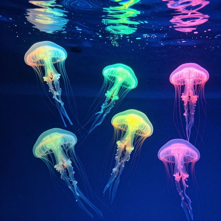 Neon-lit jellyfish gracefully drift in a mesmerizing underwater ballet, their translucent bodies glowing in vibrant hues of blue, green, yellow, and pink, creating a surreal rainbow-like spectacle beneath the rippling water's surface.