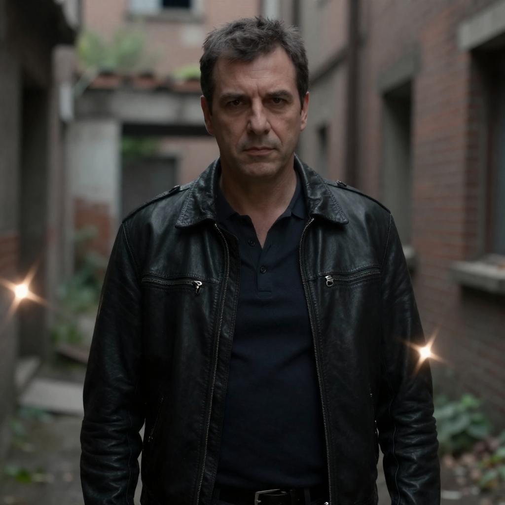Photograph of a middle-aged man with short, messy brown hair, wearing a gray, slightly torn tank top, and a white bandage on his right arm. He stands against a brick wall, smoking a cigarette, with a red-lit background. His expression is serious and focused. His right arm is raised to his mouth, holding the cigarette. A shadow of his head and shoulders falls on the brick wall to his left. The red-lit background includes a neon sign partially visible on the right.