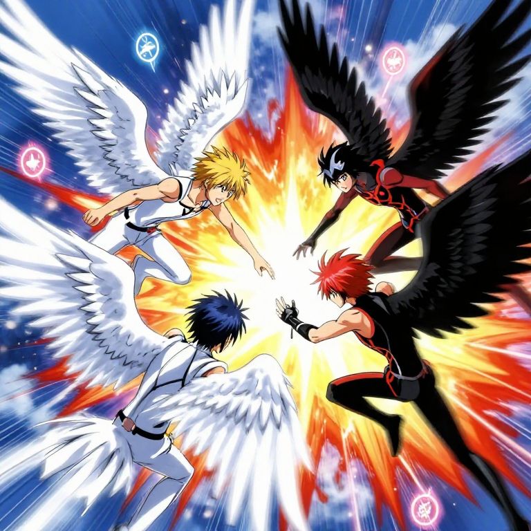 Male anime characters with wings engaged in an aerial battle, dynamic composition with motion blur and energy effects, contrasting wing designs ranging from angelic white to demonic black, vibrant explosions and glowing magical symbols enhancing the scene's intensity.