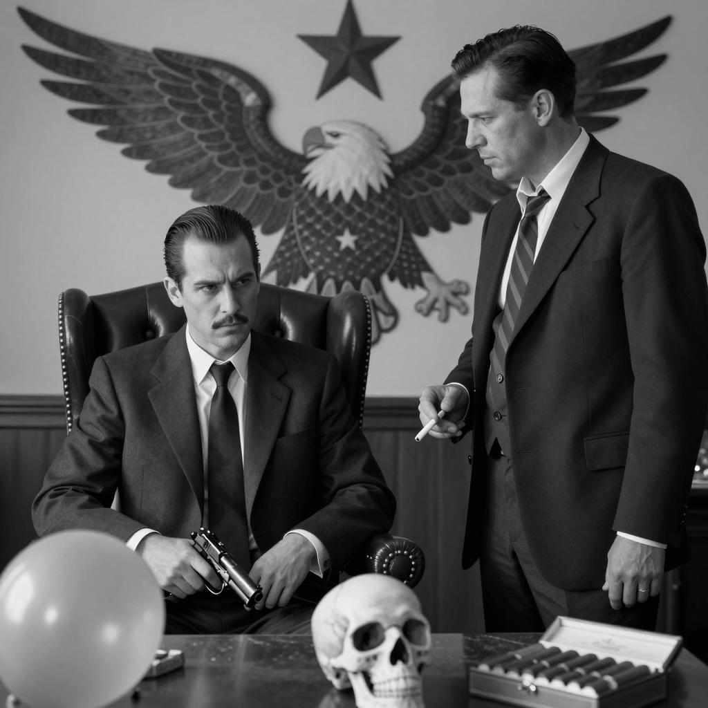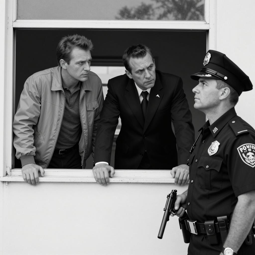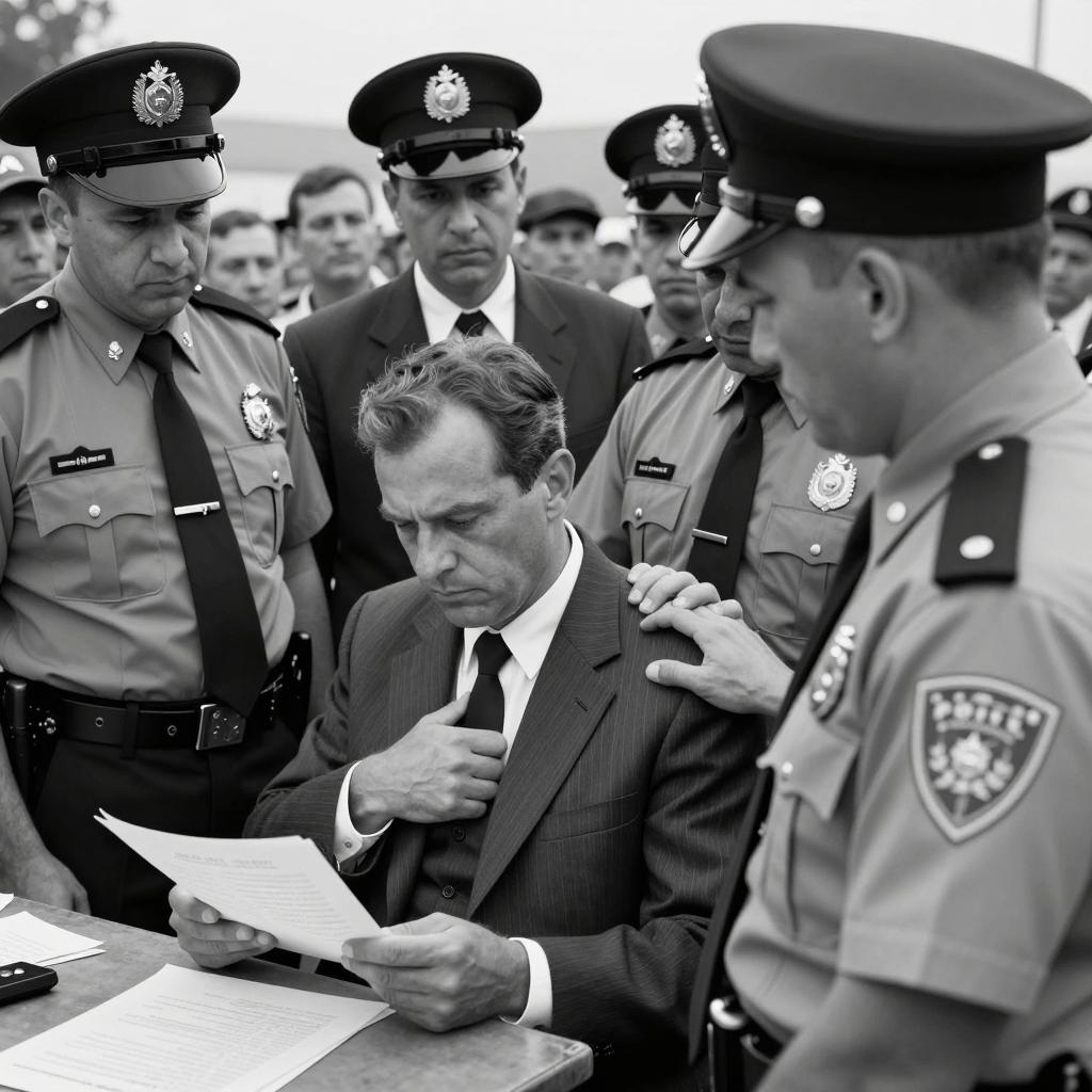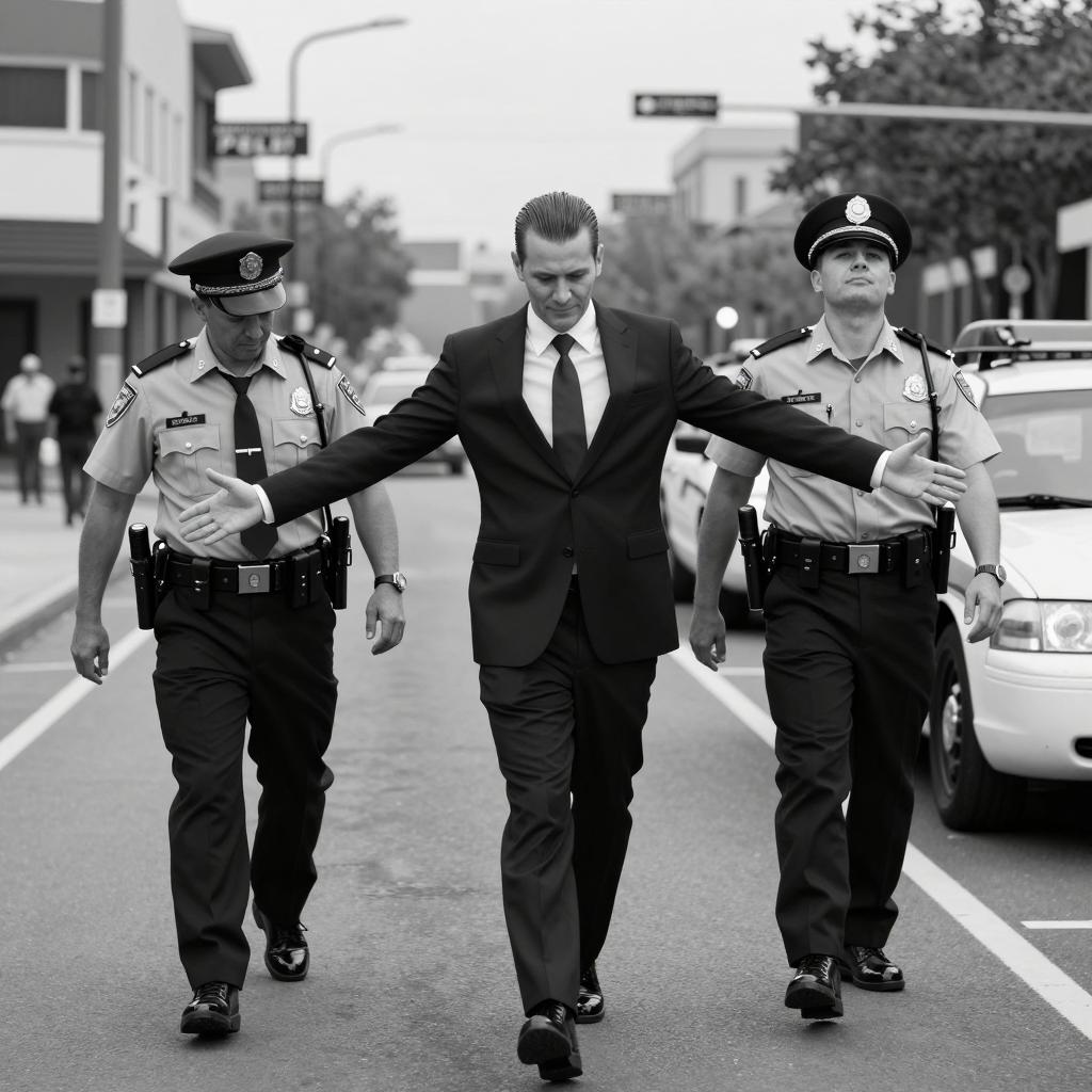 Black and white photograph of three men on a city street. Central man in dark suit with slicked-back hair, arms outstretched, walking between two police officers. Police officers wear light-colored uniforms, one leaning forward, other with head tilted back. White police car on right. Background includes buildings, street signs, and trees.