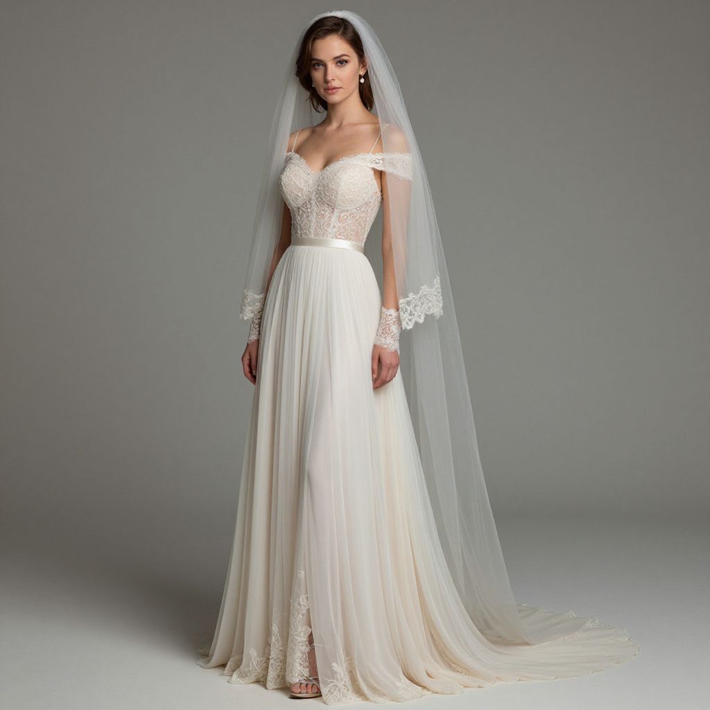 Photograph of a woman standing against a plain gray background. She has dark brown hair and is wearing an off-the-shoulder, white lace wedding gown with a fitted bodice and a flowing, pleated skirt. The gown features intricate lace detailing on the bodice and sleeves. She also wears a long, sheer white veil that drapes down her back. Her skin is fair, and she has a serious expression. The dress has a subtle, elegant sheen, and she stands with her arms relaxed by her sides, feet slightly apart.