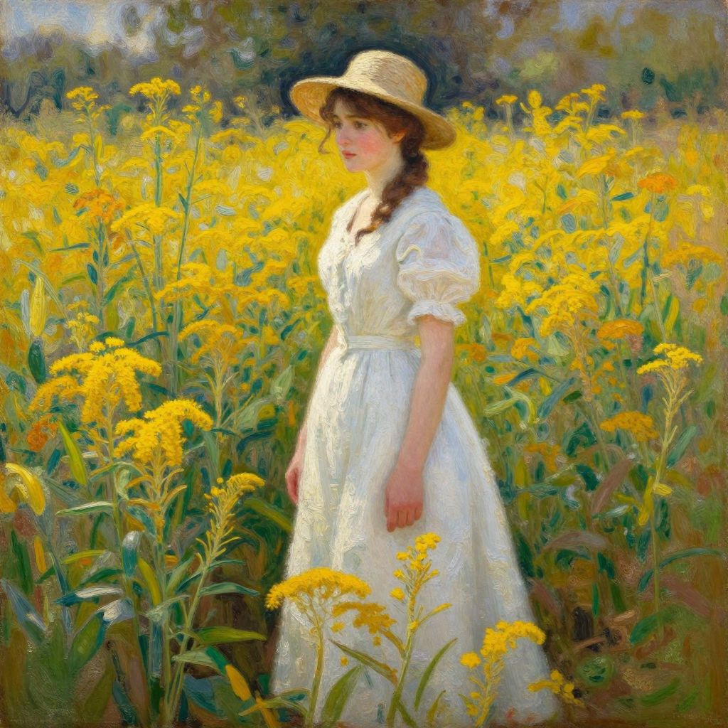 Impressionist painting of a young woman in a white dress and straw hat standing in a vibrant yellow wildflower field.