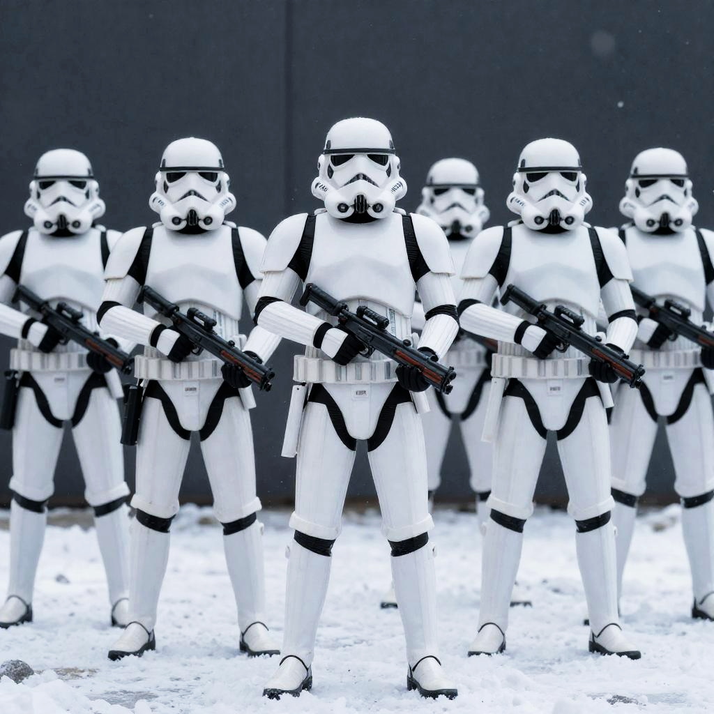Photograph of six stormtroopers standing in a snow-covered, dark background. Stormtroopers wear white armor with black straps and helmets. They hold blasters, with one on the left holding a larger gun. Snowflakes fall around them. Their expressions are neutral. The stormtroopers are closely grouped, facing forward.