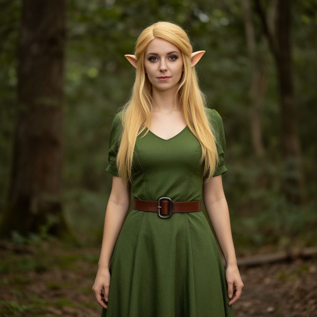 "Woodland Elf Cosplay, a woman in a green dress and a brown belt standing in a forest"