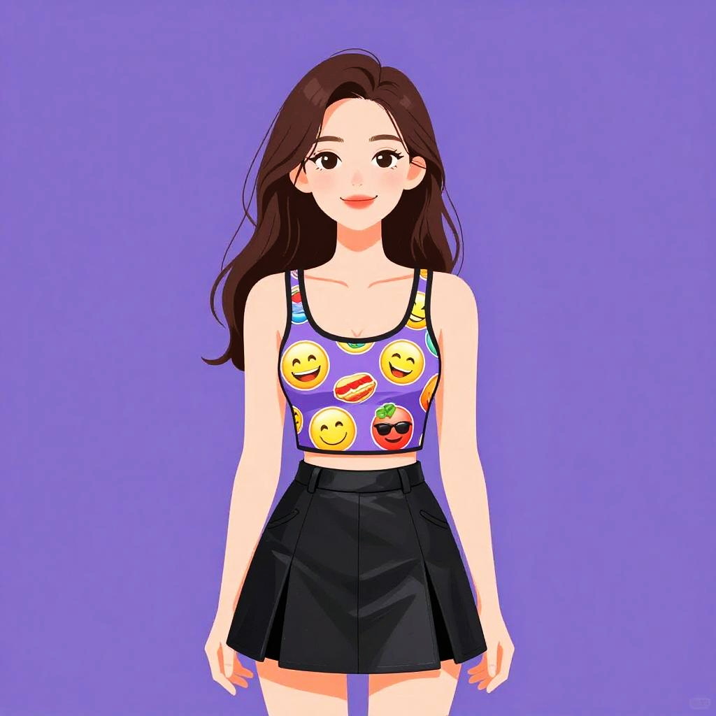 Digital anime-style drawing of a smiling young woman with long brown hair, wearing a colorful emoji-patterned tank top and black skirt, against a solid purple