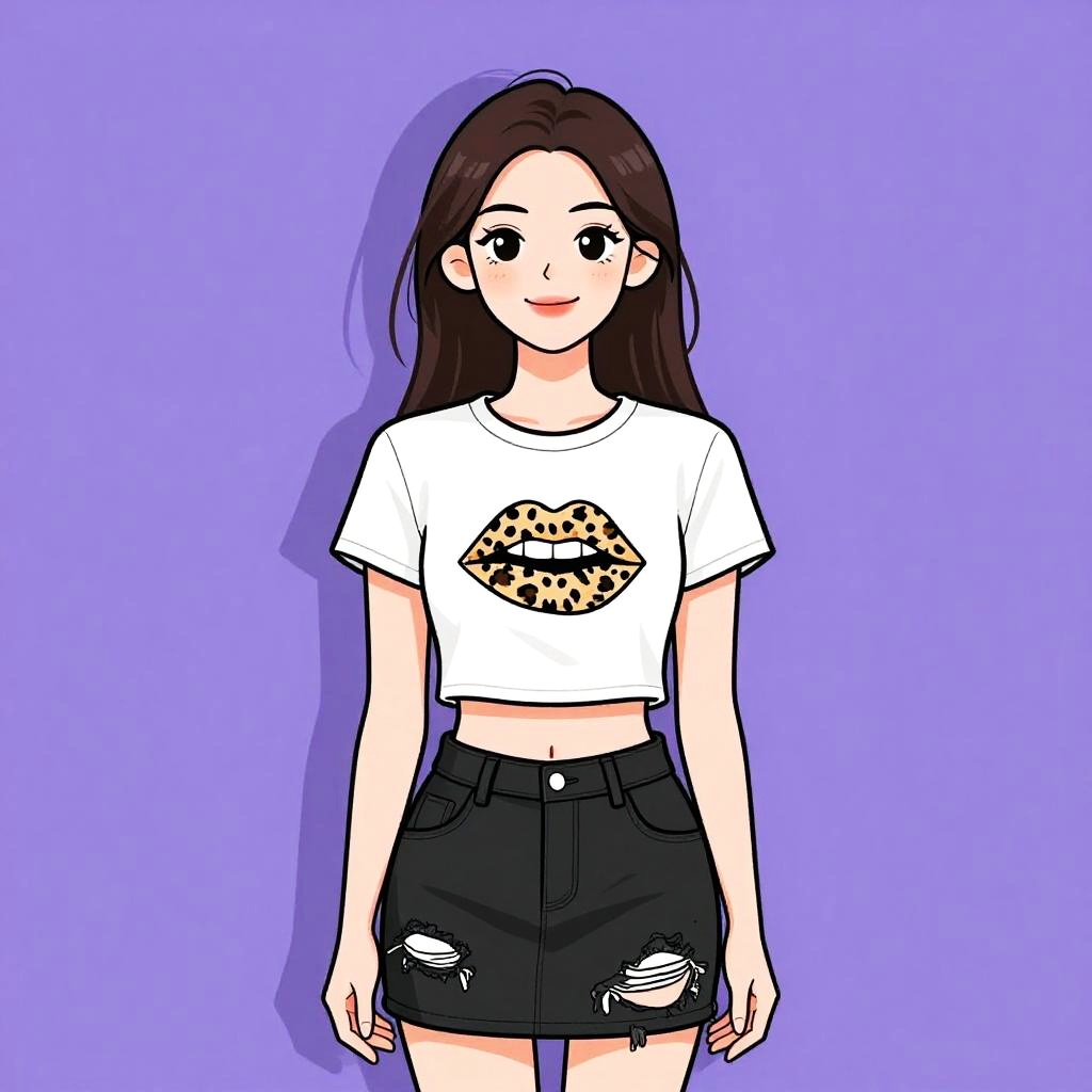 Digital anime-style drawing of a young woman with long, dark brown hair and fair skin, standing against a solid purple background. She has large, expressive black eyes and a slight smile. She wears a purple tank top adorned with various yellow smiley faces and a cartoonish lip, paired with a black, pleated mini skirt. Her arms are relaxed by her sides. The image has bold, clean lines and a bright, colorful aesthetic, typical of modern digital anime art.