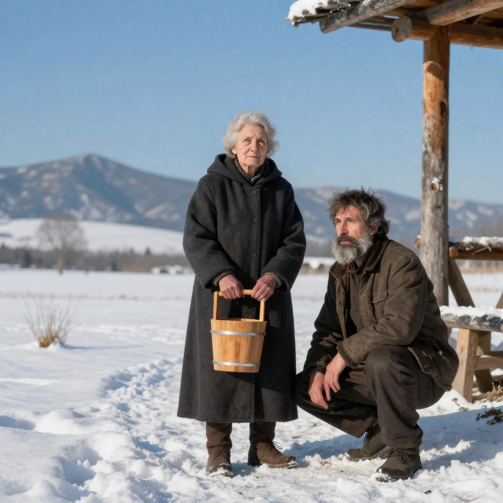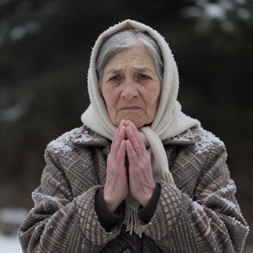 Old woman with gray hair, snow-covered headscarf, and brown and white patterned coat, hands clasped together in front, standing outdoors in dark, snowy environment. Intense, slightly worried expression. Snow on shoulders, blurred dark background. Centered, upper body shot.