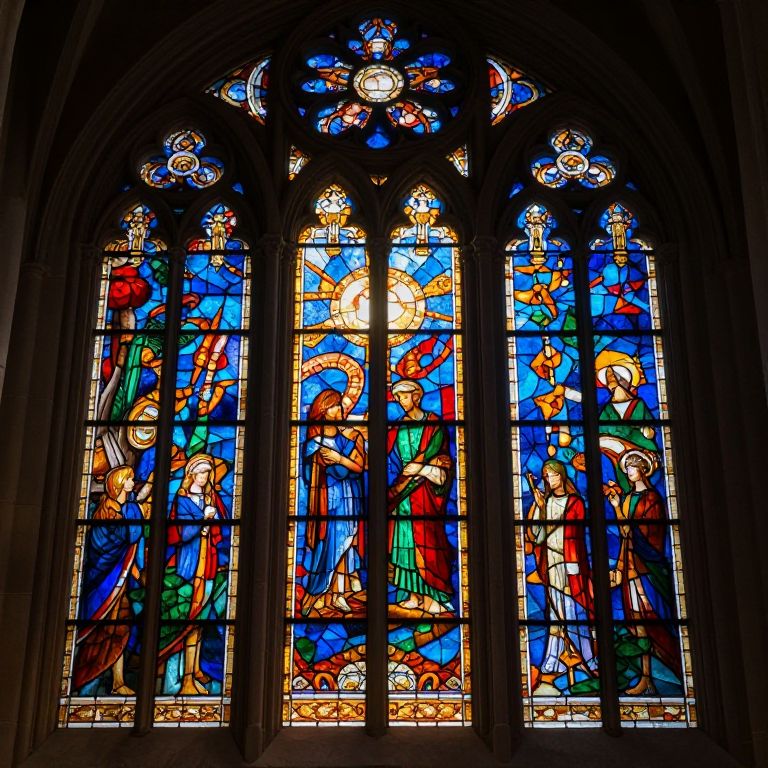 Photograph of a vibrant, multi-paneled stained glass window in a Gothic-style church. The window features three tall, arched sections adorned with colorful, detailed depictions of biblical scenes. The glass showcases a spectrum of bright blues, reds, greens, and yellows, with intricate patterns and figures in robes. Central figures include a haloed, radiant figure at the top center, surrounded by other figures in various poses. The background includes decorative, ornate floral and geometric designs. The window is framed by dark stone, with light filtering through, highlighting the vivid colors and intricate details of the glass.