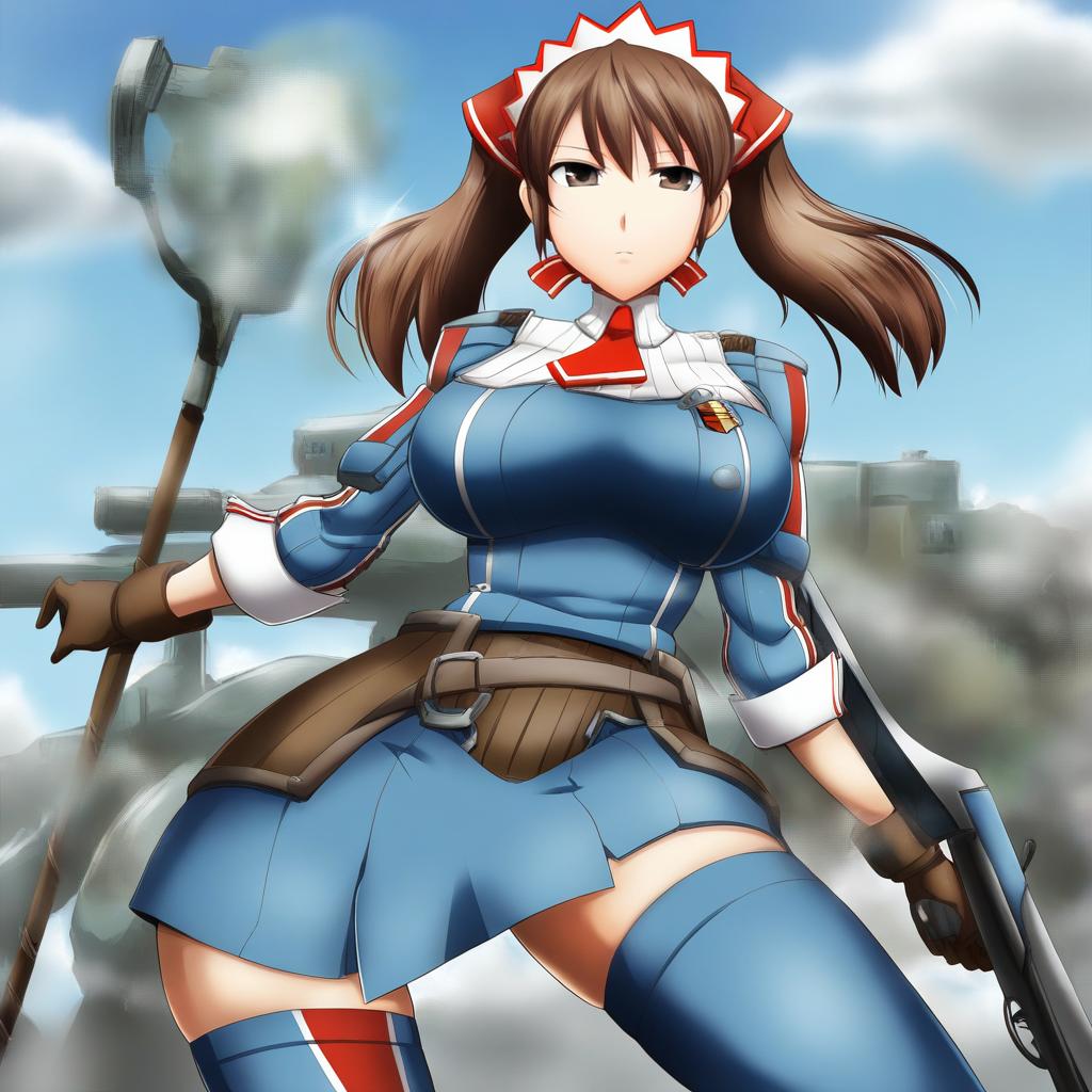 Alicia melchiott, senjou no valkyria (series), 1girl, brown eyes, brown hair, long hair, twintails, large breasts, military uniform, military uniform, thighhighs, by artist kanno takanori, leet