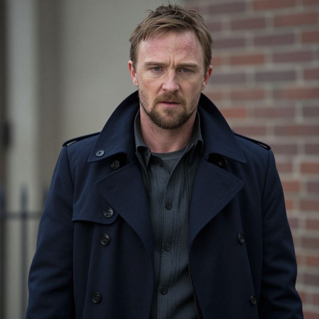 Photograph of a middle-aged white man with short, tousled brown hair and a light beard. He has a serious expression and is wearing a black, double-breasted coat over a dark gray, textured shirt. The background features a blurred brick wall on the right and a vertical, light-colored structure on the left. The lighting is natural, highlighting his facial features and the texture of his coat. The overall mood is serious and slightly somber.