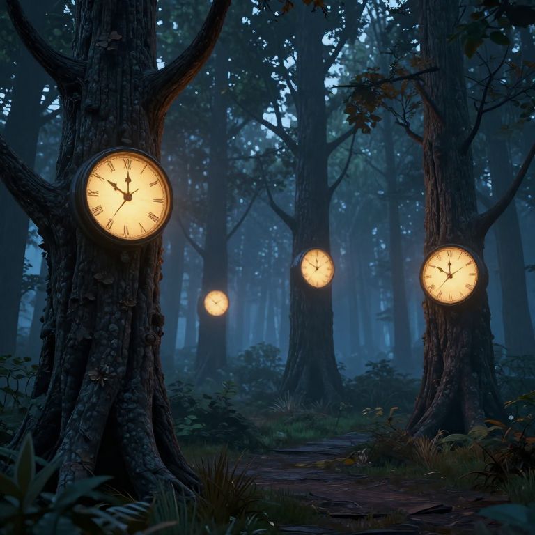 Photograph of a mystical forest at twilight. Large, glowing clock faces are mounted on dark tree trunks, emitting a warm, yellow light. The clocks are illuminated against the deep blue and black hues of the dense forest, with tall trees and mist creating a dreamy atmosphere. The forest floor is covered in grass and low-lying plants, with a narrow, shadowy path leading through the scene. The clock faces are evenly spaced, with the closest one in the foreground and others receding into the background.