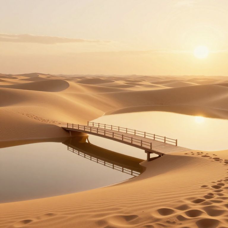 A serene 3D-rendered desert landscape bathed in the golden hour light, featuring a solitary, reflective bridge that appears to emerge from the mirrored sands, evoking a mystical and surreal atmosphere.