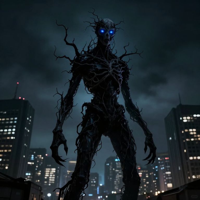 Digital artwork of a dark, twisted, humanoid creature with glowing blue eyes, standing in a night cityscape of illuminated skyscrapers.