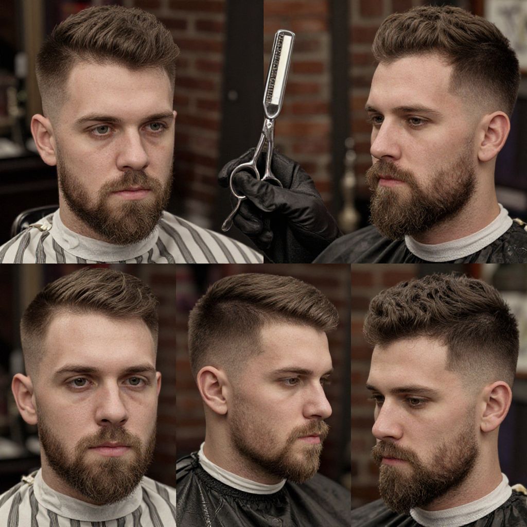Photograph collage of a bearded Caucasian man with short, styled brown hair, undergoing a hair cut in a barbershop. He has a fair complexion and wears a black-and-white barber's cape. The top left and right images show his face with the barber holding a clipper above his head. The bottom left, center, and right images display his progressively shorter hair and well-groomed beard. The background features a blurred brick wall and black barber equipment. The man's expression is neutral throughout the process. The lighting is natural, highlighting his facial features and hair texture.