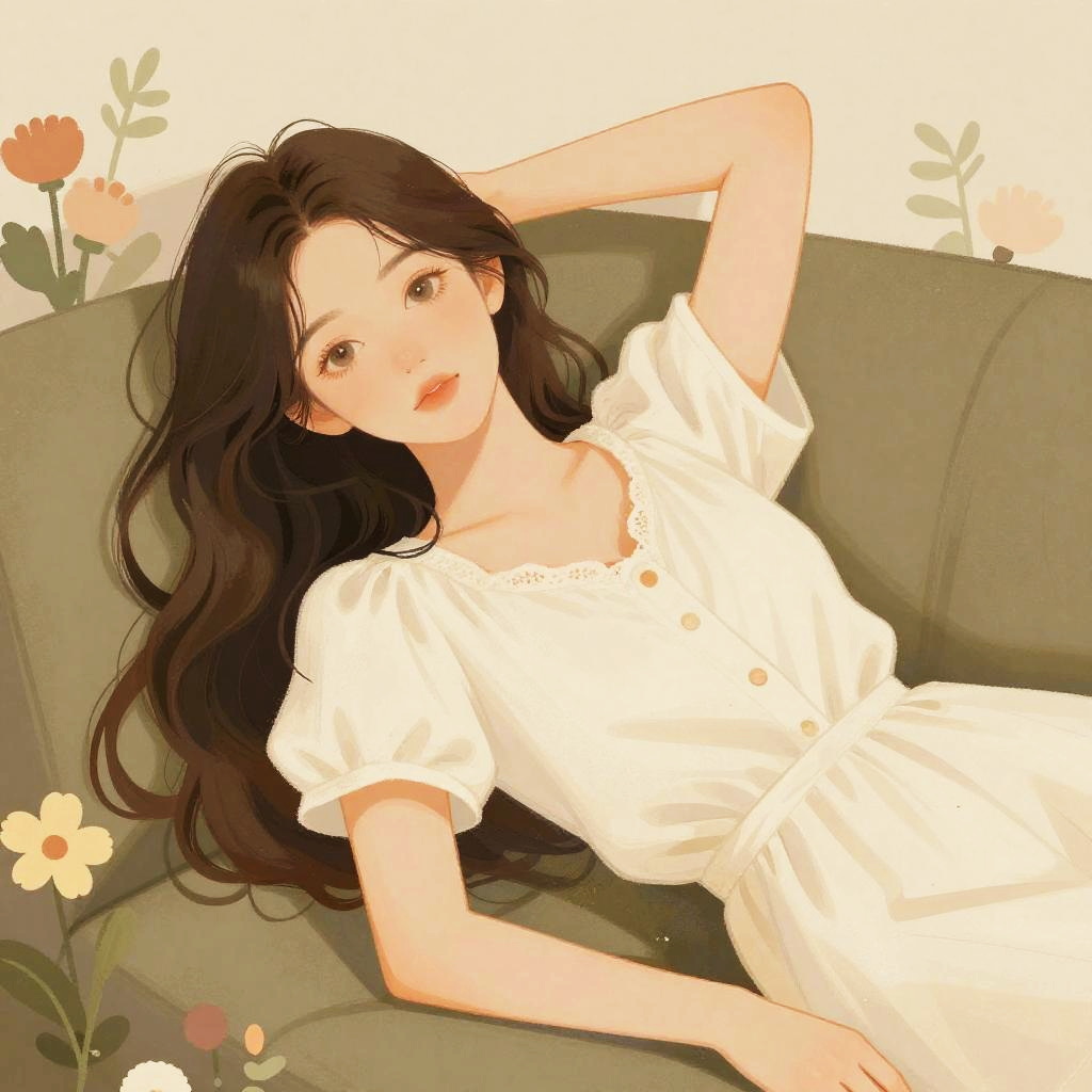 This vibrant illustration features a young woman reclining in a relaxed pose, showcasing soft and warm hues. The artwork captures a floral theme with subtle hints of nature integrated into the background, emphasizing a serene and artistic ambiance.