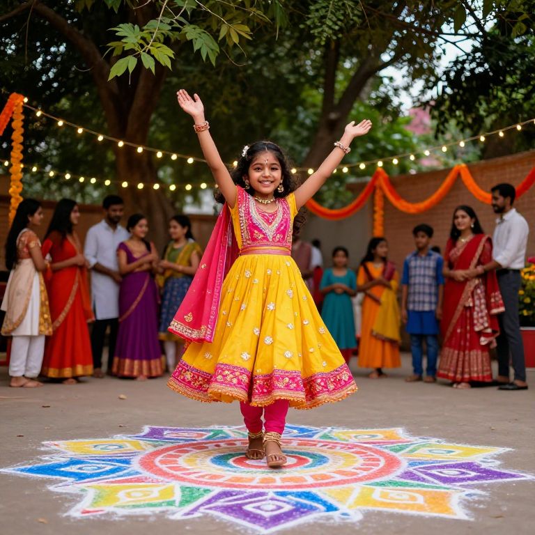 Petite Indian teen enjoying a festive celebration outdoors, colorful rangoli patterns on the ground, fairy lights hanging amidst lush trees, bursting with joyful energy, wearing bright, festive ethnic wear, surrounded by happy families and traditional decorations.