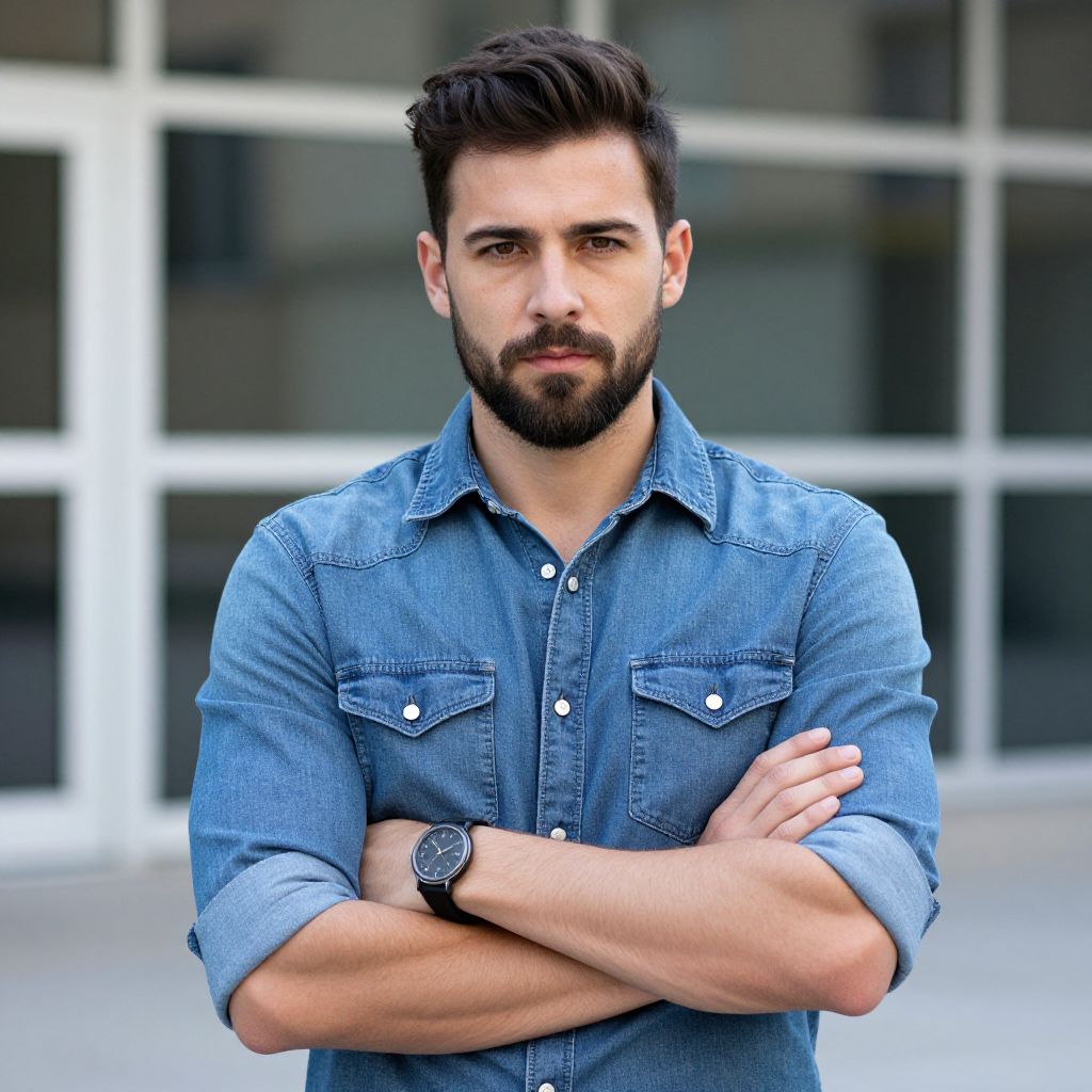 Photograph of a handsome, bearded man with short, dark brown hair standing outdoors. He's wearing a blue denim shirt with rolled-up sleeves, and a black watch on his left wrist. His arms are crossed confidently in front of him. The background is slightly blurred, showing a modern building with large windows. The overall vibe is stylish and casual.