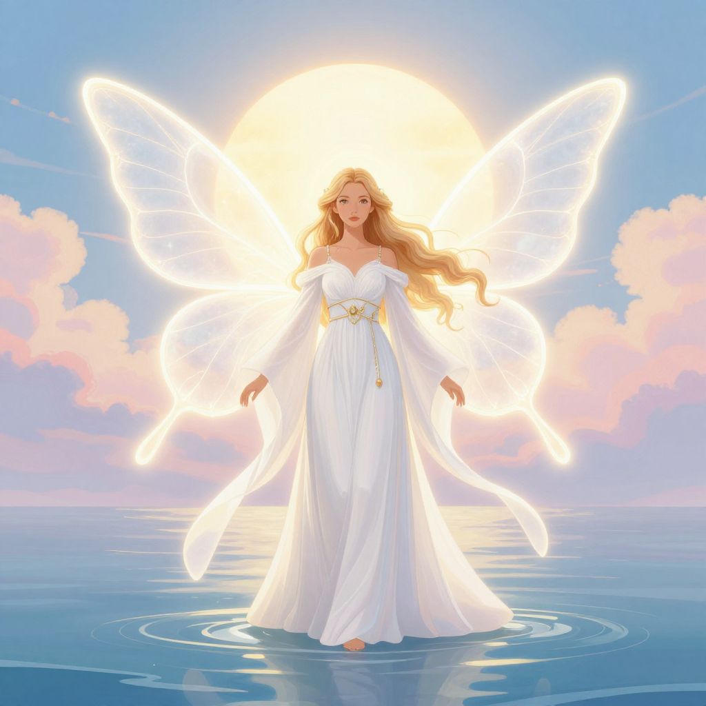 Digital illustration of a serene angel with glowing white wings and dress, floating among clouds against a starry blue sky.