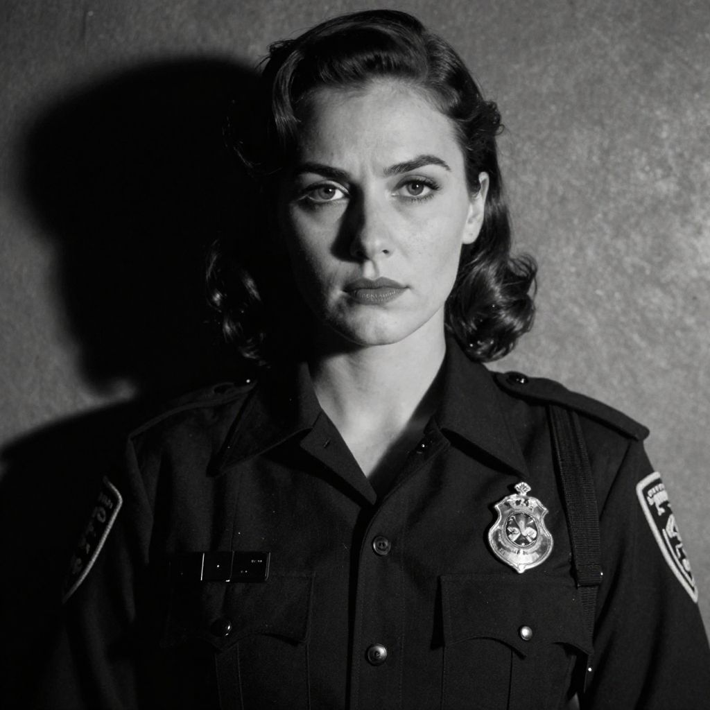 Black-and-white photograph of a serious, dark-haired, 1940s-style woman in a police uniform, with a badge and shadowed background.