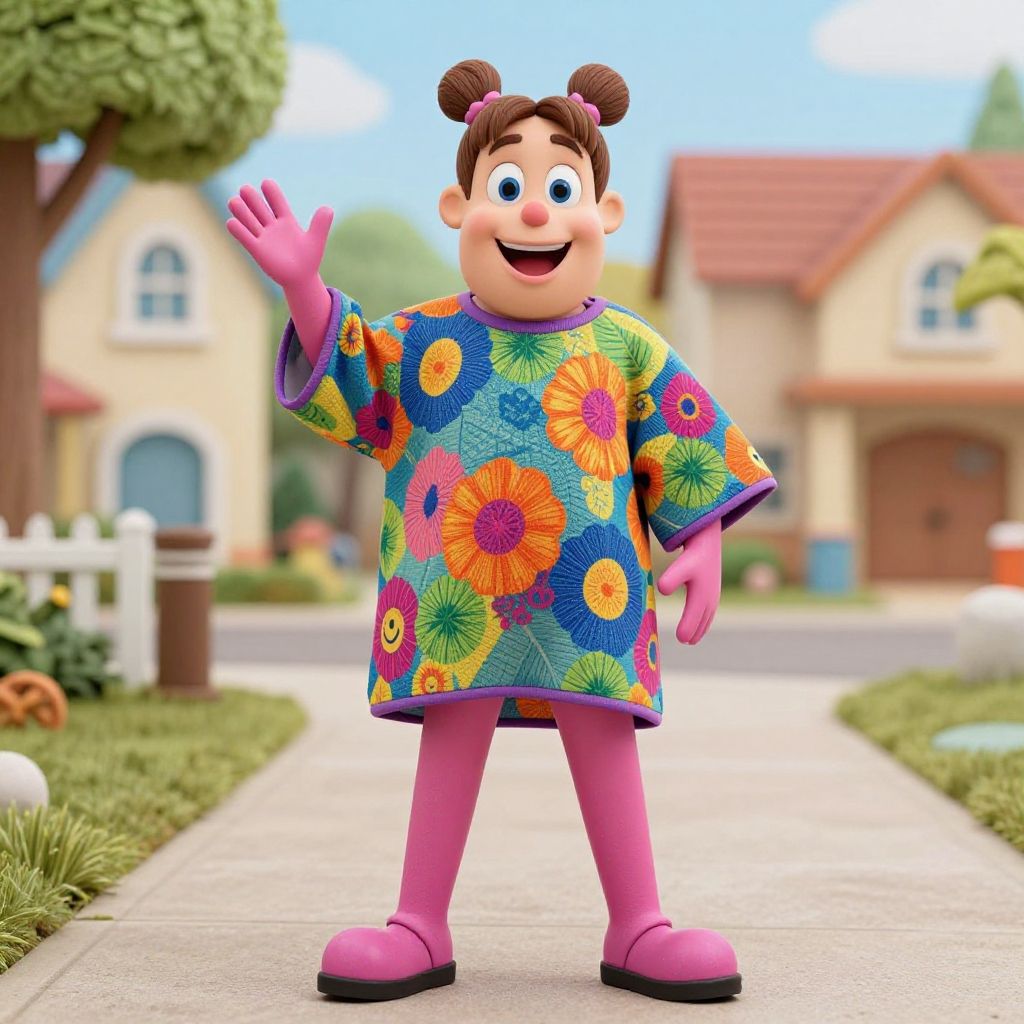 This is a colorful CGI image of a cheerful cartoon character standing on a suburban sidewalk. The character has large, expressive eyes and a wide smile, with brown hair styled in two buns. They wear a vibrant floral-patterned dress in shades of blue, green, orange, and yellow, paired with pink leggings and matching pink shoes. Their right hand is raised in a friendly wave. The background features a blurred suburban neighborhood with yellow houses, white picket fences, and green trees under a clear blue sky. The sidewalk is concrete, bordered by green grass and small flowers.