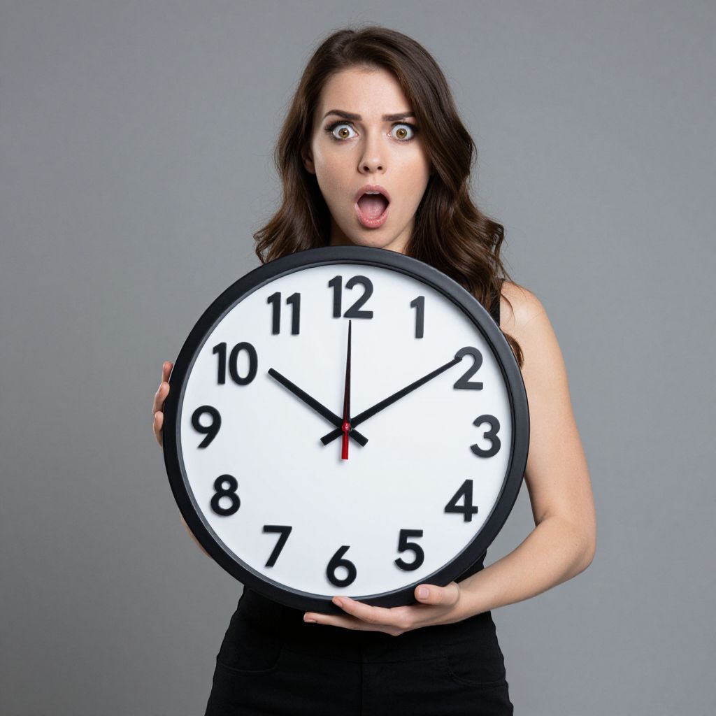 Woman holding a large clock with a surprised expression, emphasizing the passage of time.