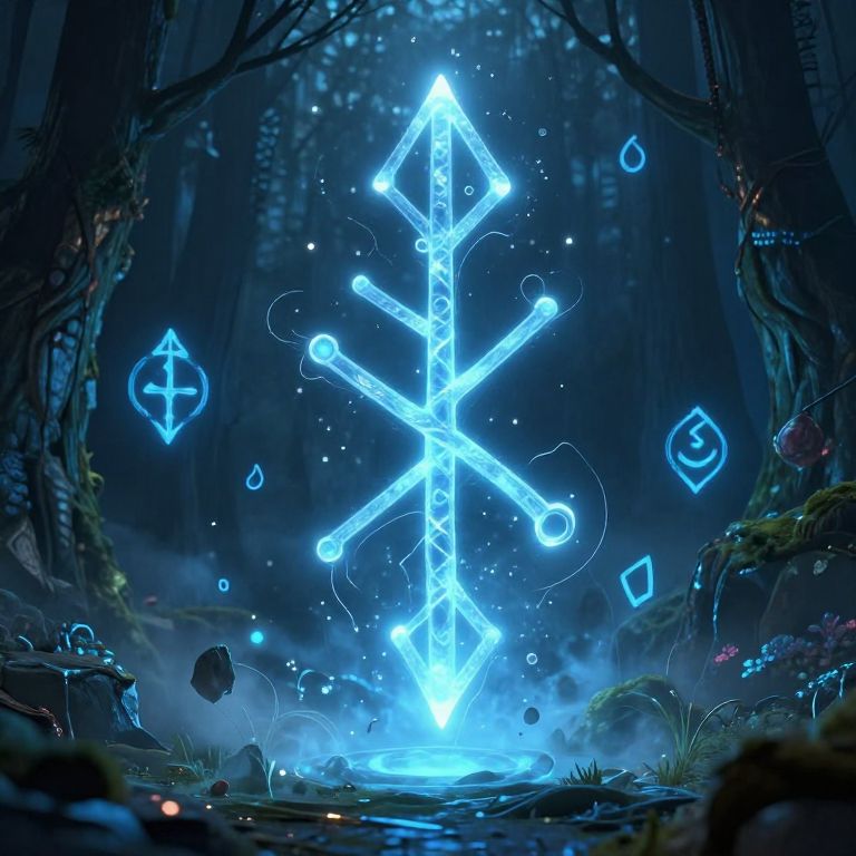 Enr theme concept art depicting an ancient mysterious rune glowing with ethereal blue light, surrounded by floating arcane symbols and mist, set in a dark enchanted forest with subtle magical ambiance and intricate details.