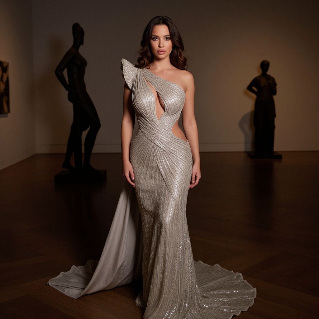 Photograph of a dark-haired woman with olive skin and a curvy physique, standing in a dimly lit room. She wears an elegant, shimmering silver one-shoulder gown with intricate, crisscrossing patterns and a keyhole cutout. The dress has a long, flowing train that pools on the wooden floor. Her makeup is subtle, with dark eyeliner and nude lipstick. In the background, two shadowy silhouettes of female figures are cast against the wall, adding depth to the scene. The overall ambiance is sophisticated and dramatic, highlighting the luxurious attire.