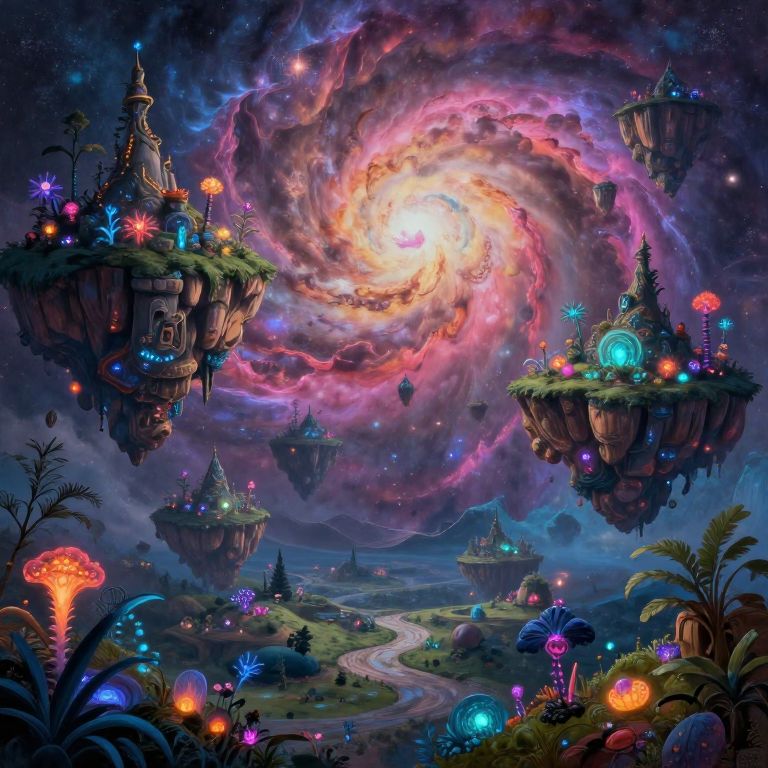 Stable diffusion random prompt creating a surreal landscape with floating islands, bioluminescent plants, and a vibrant nebula sky, intricate details, painterly style, vibrant colors, dreamlike atmosphere, highly detailed environment, fantasy art
