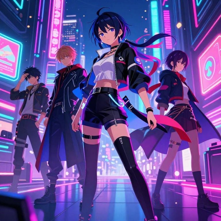 Anime-inspired latest: A vibrant, modern anime scene set in a neon-lit futuristic city, featuring dynamic characters in stylish, flowing clothing with glowing accessories, rich color contrasts, and detailed backgrounds inspired by contemporary Japanese anime aesthetics. Digital art style with cinematic lighting and smooth textures.