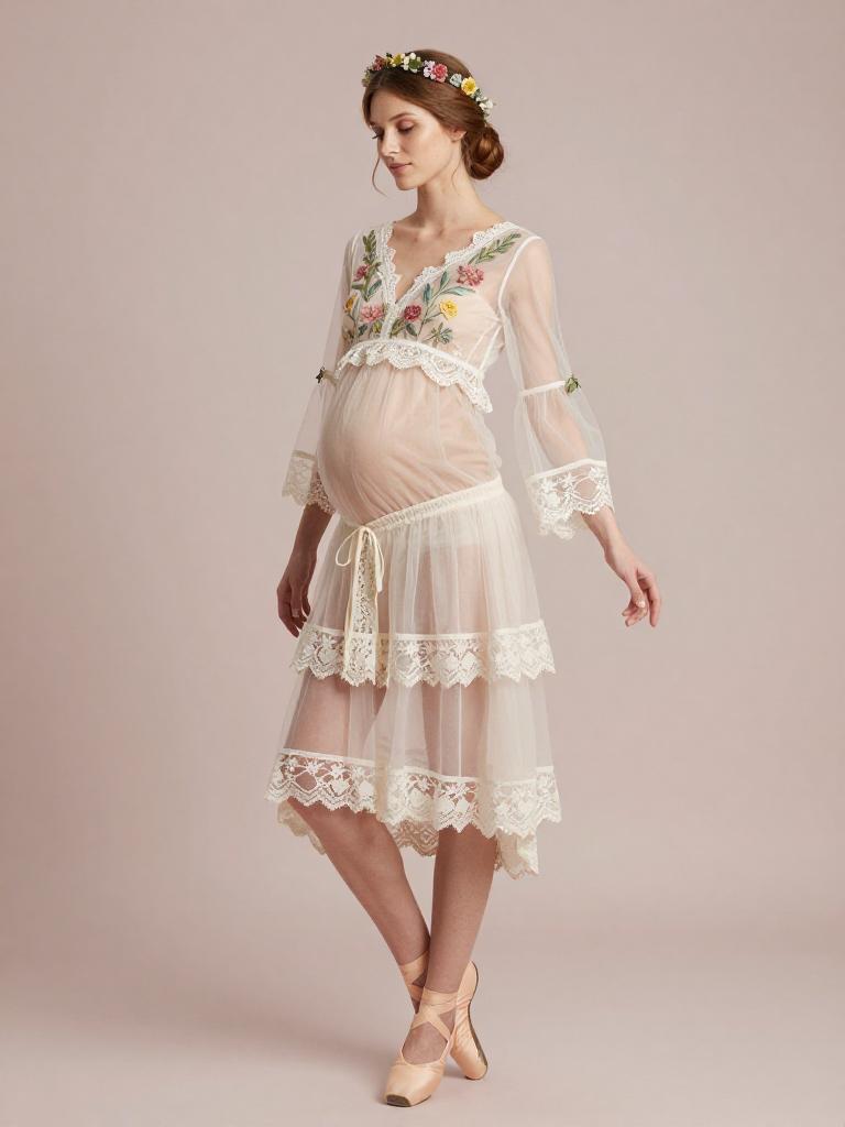 Sexy fashion outfit, serene pregnant woman with curly black hair in a loose natural style and plus-size pregnant body with full curves and defined bump, dressed in a fairy outfit, whimsical ethereal style, wearing sheer lace maternity blouse with embroidered flowers with tiered organza maternity skirt with subtle shimmer and barefoot with dainty anklets, floral headband, editorial fantasy maternity style, standing in cream-colored seamless paper backdrop studio background, soft dreamy lighting, high-end maternity fashion photography, ultra-detailed, big breasts
