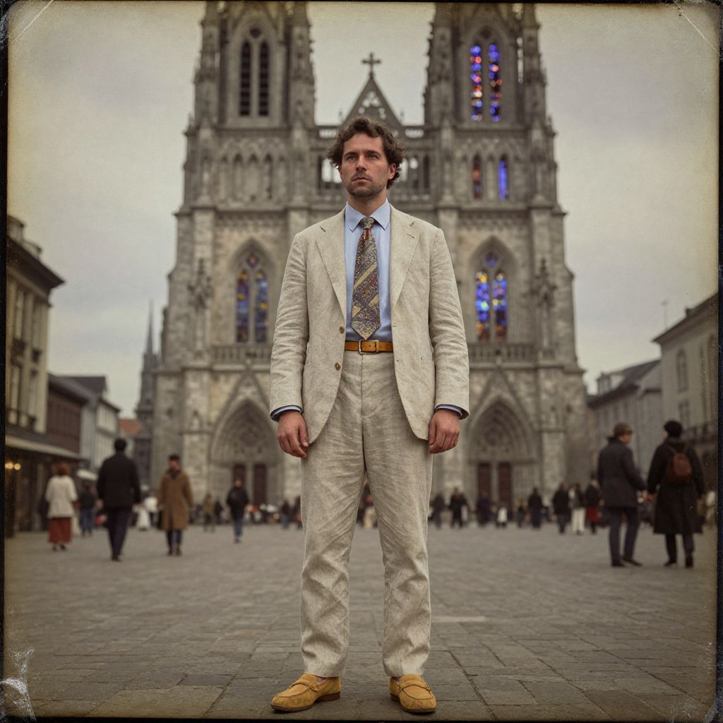 A man, crisp white cotton button-up shirt, light gray drawstring trousers, minimalist sandals, standing in a charming cobblestone square, local musicians nearby, twinkling lights overhead, collodion wet plate style, contemplative expression. Man has masculine face and piercing eyes