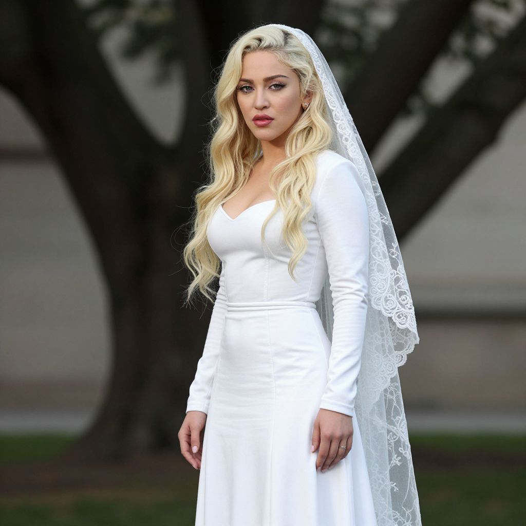 Photograph of a blonde woman with long wavy hair, wearing a white long-sleeve wedding dress and lace veil, standing outdoors with blurred trees