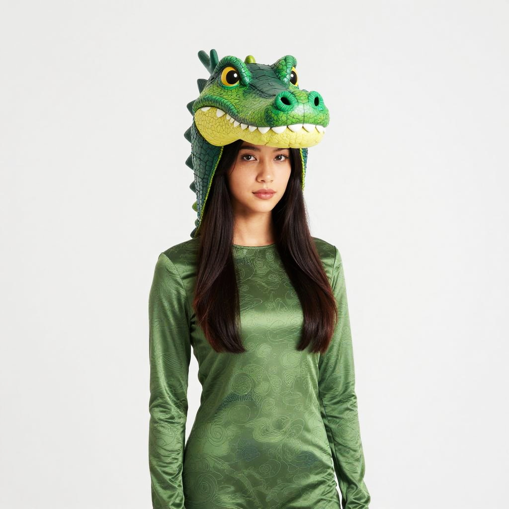 Crocodile Costume Girl, woman in a green costume with a green dragon head