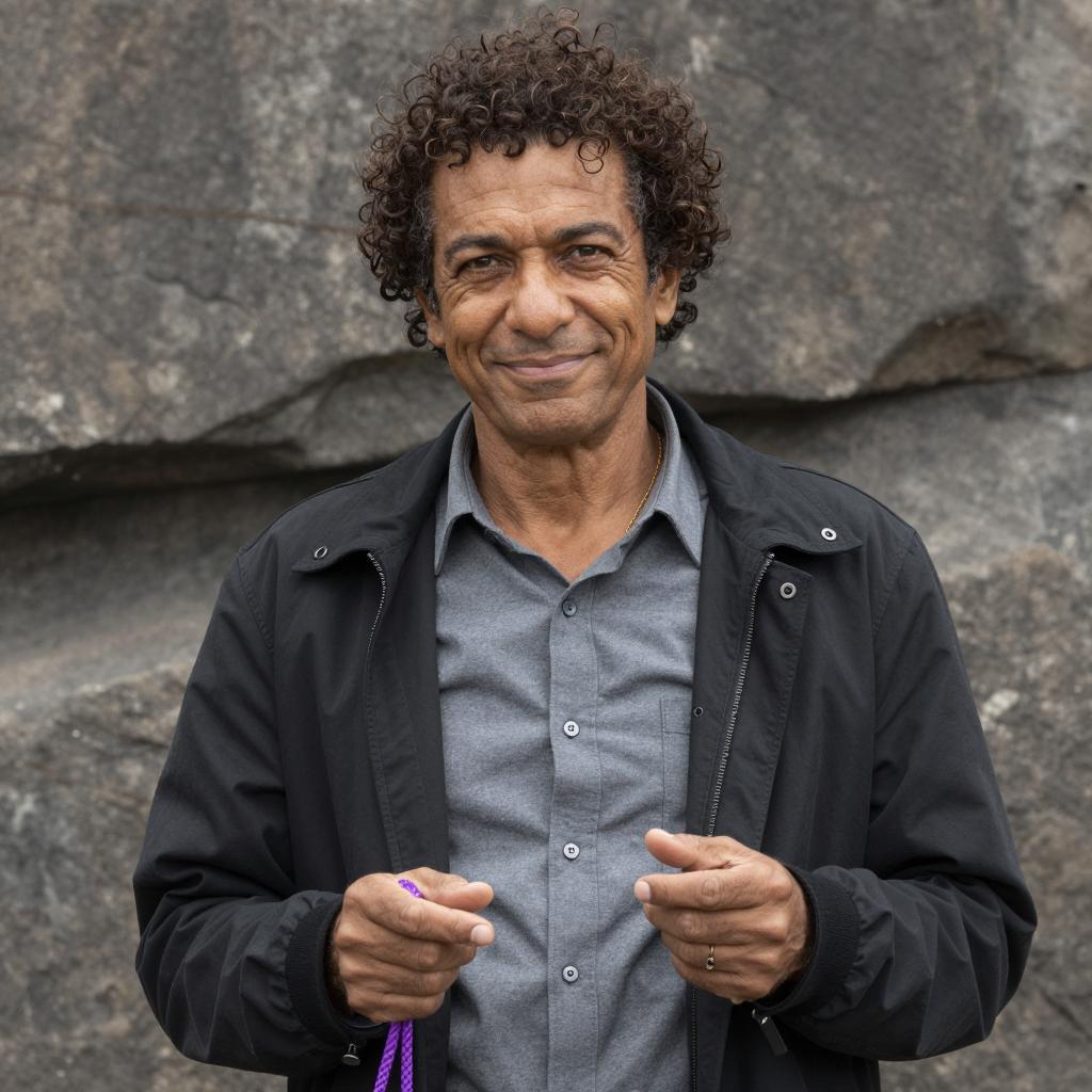 A middle-aged man with curly dark hair, wearing a floral shirt over a gray t-shirt, gives a thumbs up while speaking into a microphone. Two microphones are in front of him, with a music console and cables on the right. Another person is blurred in the background. The man's facial expression is intense and focused.