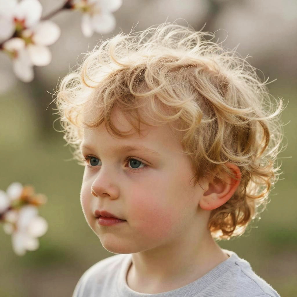 Close-up of strawberry blonde boy hair, intricate curls glowing in morning light, natural setting with blooming flowers, serene mood, hyper-realistic portrait with soft focus